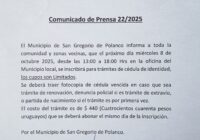 El Municipio de San Gregorio de Polanco informa a toda la comunidad y zonas vecinas, que el próximo día miércoles 8 de octubre de 2025 desde las 13 a las 18 hs. en la oficina de Municipio Local, se inscribirá para trámites de cédula de identidad, los cupos son limitados.