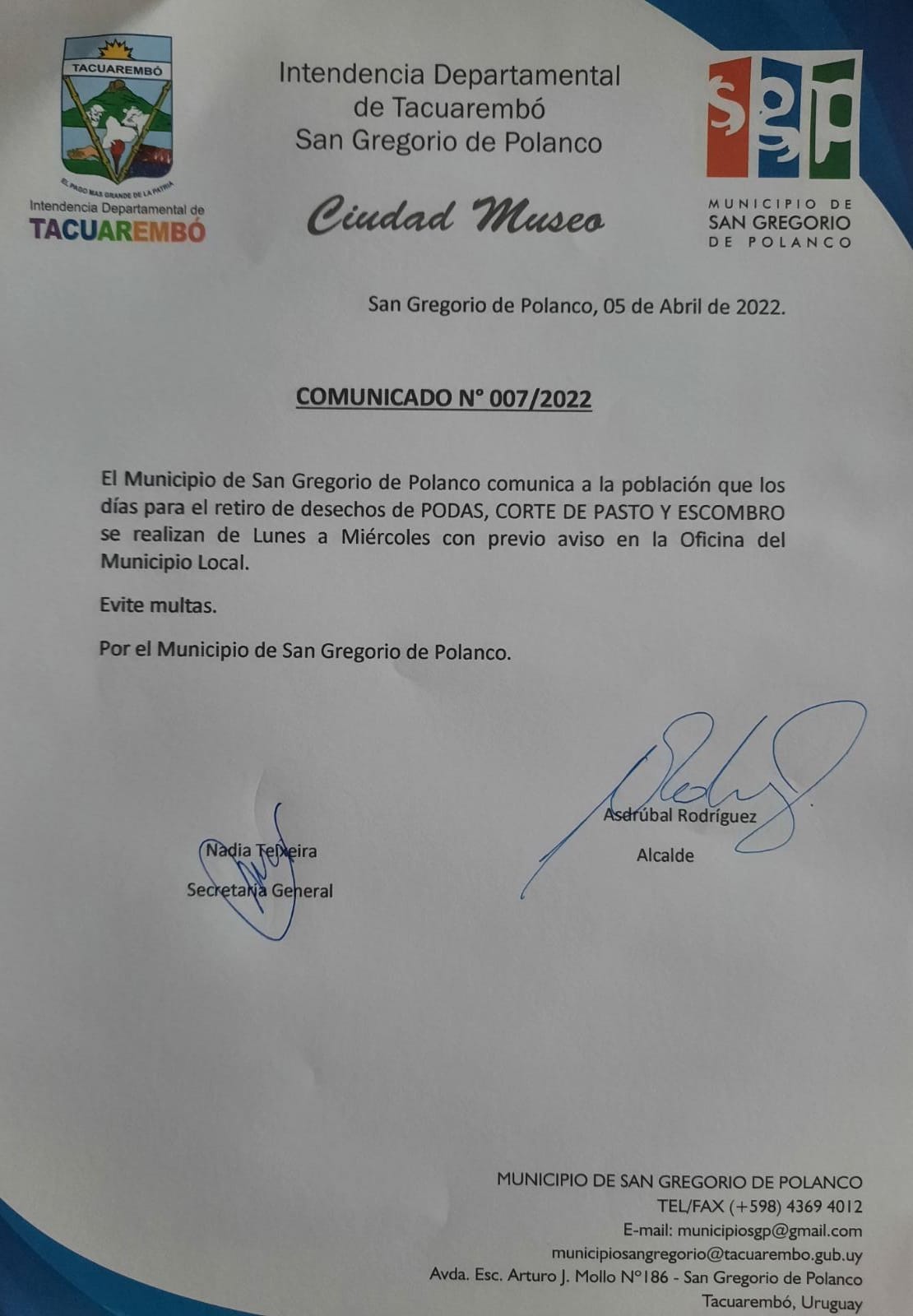 El Municipio de San Gregorio de Polanco comunica a la población que los días para el retiro de desechos de PODAS, CORTE DE PASTO Y ESCOMBRO se realizan de Lunes a Miércoles con previo aviso en la Oficina del Municipio Local.